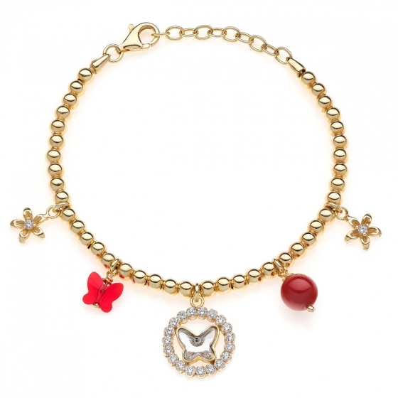Grazioso bracciale in Argento 925 dorato con cristalli e perle, che ha come protagonisti farfalle e motivi floreali, il tutto impreziosito da pietre Cubic Zirconia di alta qualità.