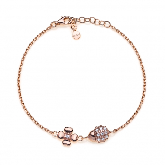 Fine bracciale in Argento 925 rosè con coccinella e quadrifoglio impreziositi da pietre Cubic Zirconia di alta qualità.