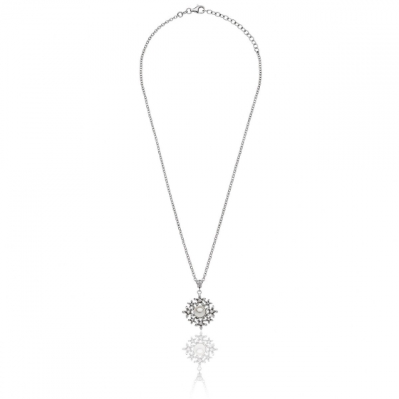 Collana in Argento 925 rodiata, con pendente a scorrere, costituito da un motivo floreale impreziosito da pietre cubic zirconia, e perla di cristallo al centro.