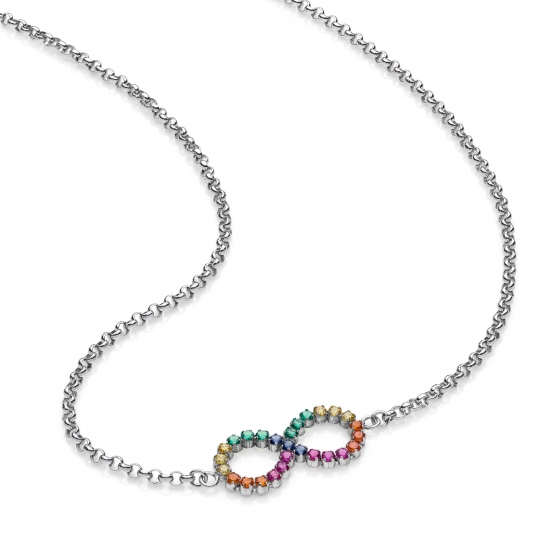 Elegante collana in Argento 925 rodiato, con infinito centrale realizzato con pietre Cubic Zirconia di alta qualità sui toni dell'arcobaleno.